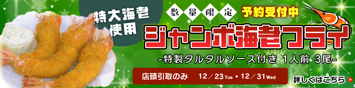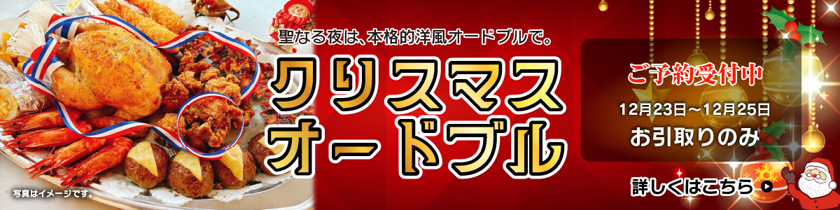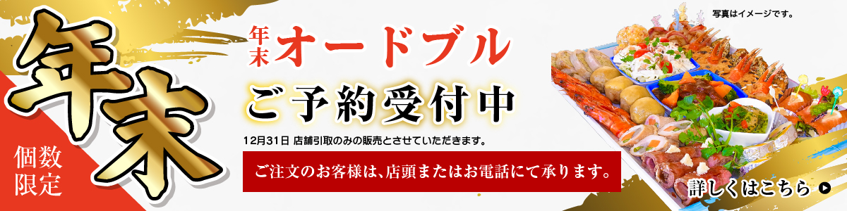 【年末年始のご案内】12月31日オードブル引き取りのみ、1月1日〜1月3日休業日となっております。インターネット販売につきましては、12月25日までのご注文で年内のお届けとさせていただきます。