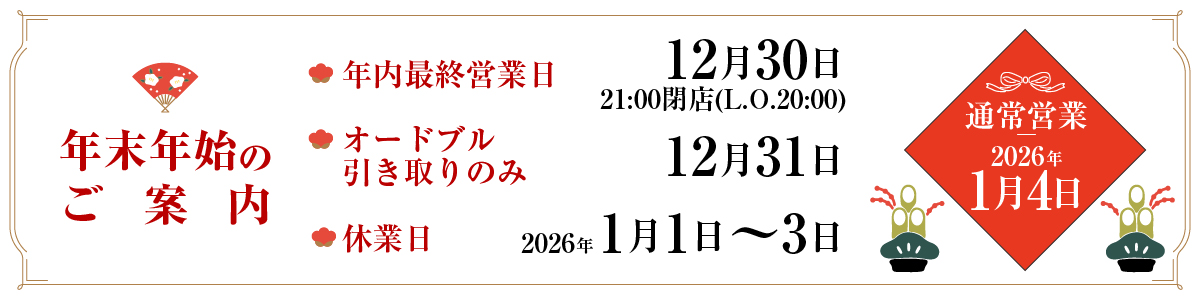 【年末年始のご案内】年末年始の営業につきまして、12月30日は21:00閉店(L.O.20:00)・12月31日オードブル引き取りのみ・1月1日〜1月3日休業日となっております。1月4日より通常営業になります。何卒ご理解くださいますよう、お願い申し上げます。